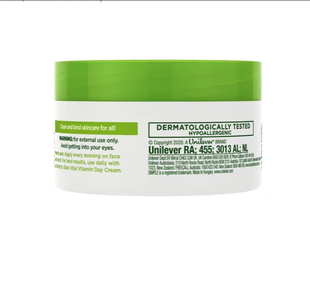 - Simple Kind to Skin Vital Vitamin Night Cream is PETA certified and vegan. Globally, Simple does not test on animals